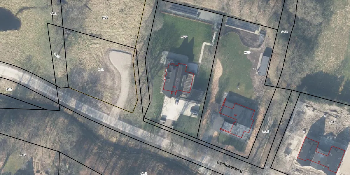 Het perceel waarop Eschbeekweg 54 staat heeft een oppervlakte van 2518 m². Dit is een zeer groot perceel. De perceeloppervlakte wordt geregistreerd door het Kadaster. Gedetailleerde informatie over de maten van dit perceel kunt u vinden in het rapport Kadastrale kaart met maatvoering van Eschbeekweg 54.