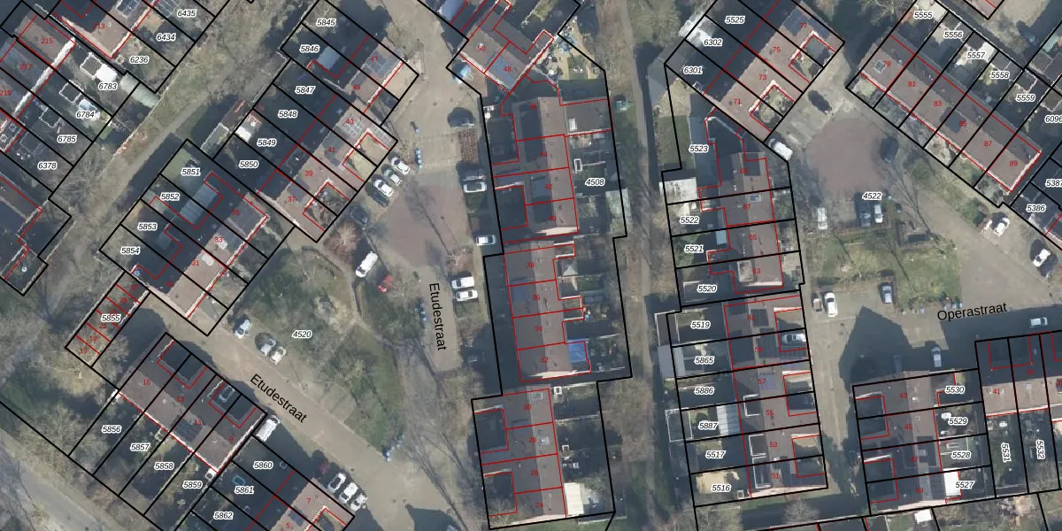 Het perceel waarop Etudestraat 38 staat heeft een oppervlakte van 2954 m². Dit is een zeer groot perceel. De perceeloppervlakte wordt geregistreerd door het Kadaster. Gedetailleerde informatie over de maten van dit perceel kunt u vinden in het rapport Kadastrale kaart met maatvoering van Etudestraat 38.
