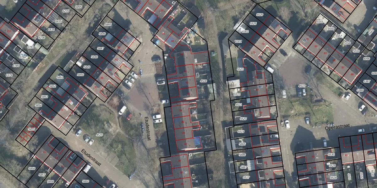 Het perceel waarop Etudestraat 40 staat heeft een oppervlakte van 2954 m². Dit is een zeer groot perceel. De perceeloppervlakte wordt geregistreerd door het Kadaster. Gedetailleerde informatie over de maten van dit perceel kunt u vinden in het rapport Kadastrale kaart met maatvoering van Etudestraat 40.