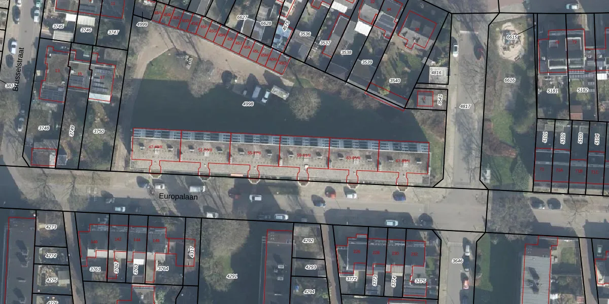 Het perceel waarop Europalaan 61-A staat heeft een oppervlakte van 4342 m². Dit is een zeer groot perceel. De perceeloppervlakte wordt geregistreerd door het Kadaster. Gedetailleerde informatie over de maten van dit perceel kunt u vinden in het rapport Kadastrale kaart met maatvoering van Europalaan 61-A.