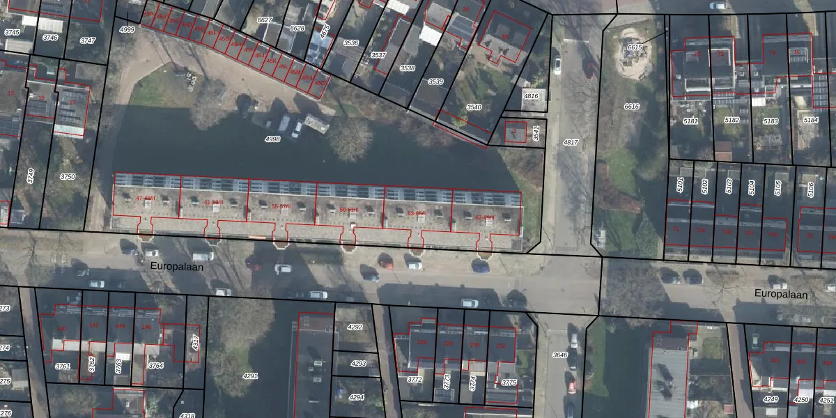 Het perceel waarop Europalaan 63-A staat heeft een oppervlakte van 4342 m². Dit is een zeer groot perceel. De perceeloppervlakte wordt geregistreerd door het Kadaster. Gedetailleerde informatie over de maten van dit perceel kunt u vinden in het rapport Kadastrale kaart met maatvoering van Europalaan 63-A.