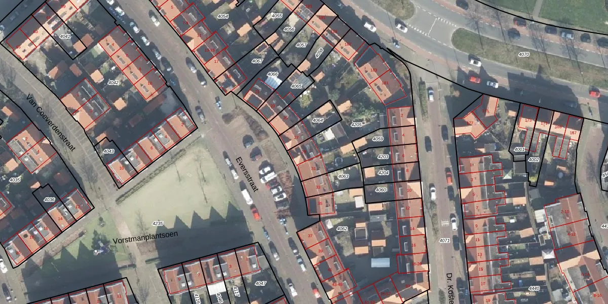 Het perceel waarop Eversstraat 29 staat heeft een oppervlakte van 1180 m². Dit is een zeer groot perceel. De perceeloppervlakte wordt geregistreerd door het Kadaster. Gedetailleerde informatie over de maten van dit perceel kunt u vinden in het rapport Kadastrale kaart met maatvoering van Eversstraat 29.