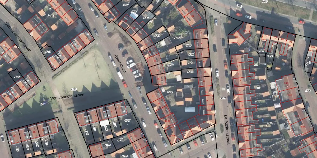 Het perceel waarop Eversstraat 35 staat heeft een oppervlakte van 1412 m². Dit is een zeer groot perceel. De perceeloppervlakte wordt geregistreerd door het Kadaster. Gedetailleerde informatie over de maten van dit perceel kunt u vinden in het rapport Kadastrale kaart met maatvoering van Eversstraat 35.
