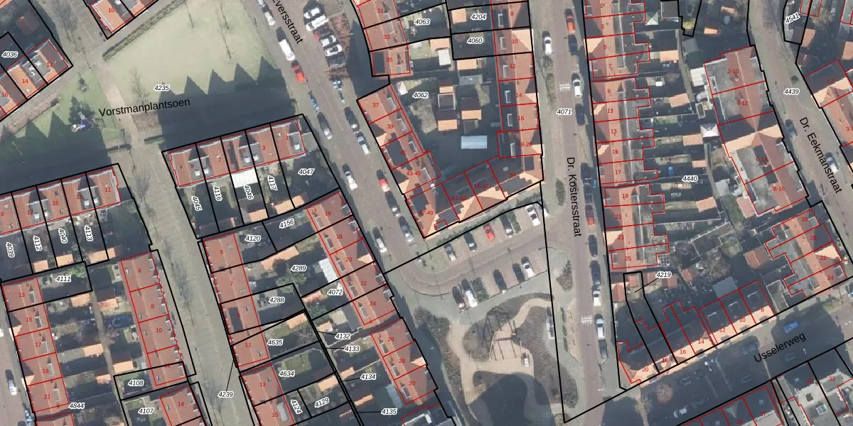 Het perceel waarop Eversstraat 49 staat heeft een oppervlakte van 1412 m². Dit is een zeer groot perceel. De perceeloppervlakte wordt geregistreerd door het Kadaster. Gedetailleerde informatie over de maten van dit perceel kunt u vinden in het rapport Kadastrale kaart met maatvoering van Eversstraat 49.