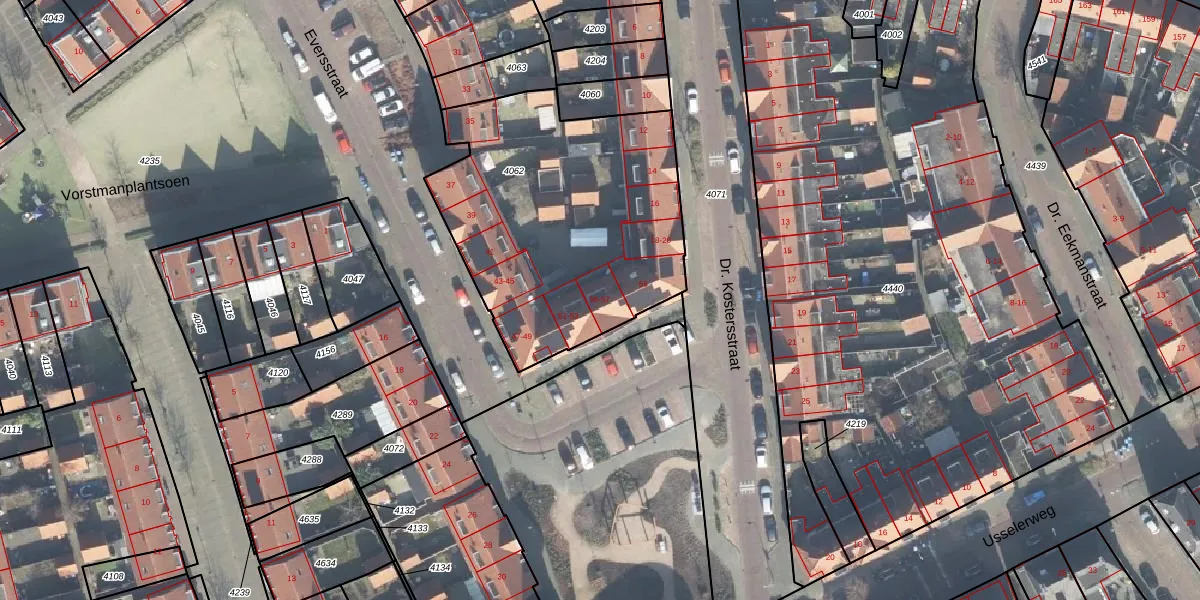 Het perceel waarop Eversstraat 55 staat heeft een oppervlakte van 1412 m². Dit is een zeer groot perceel. De perceeloppervlakte wordt geregistreerd door het Kadaster. Gedetailleerde informatie over de maten van dit perceel kunt u vinden in het rapport Kadastrale kaart met maatvoering van Eversstraat 55.