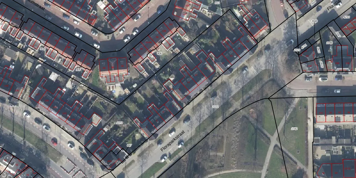 Het perceel waarop Floraparkstraat 9 staat heeft een oppervlakte van 5045 m². Dit is een zeer groot perceel. De perceeloppervlakte wordt geregistreerd door het Kadaster. Gedetailleerde informatie over de maten van dit perceel kunt u vinden in het rapport Kadastrale kaart met maatvoering van Floraparkstraat 9.