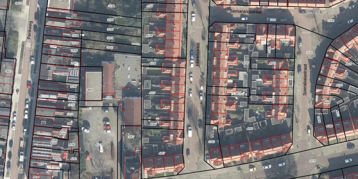 Het perceel waarop Floresstraat 72 staat heeft een oppervlakte van 725 m². Dit is een groot perceel. De perceeloppervlakte wordt geregistreerd door het Kadaster. Gedetailleerde informatie over de maten van dit perceel kunt u vinden in het rapport Kadastrale kaart met maatvoering van Floresstraat 72.