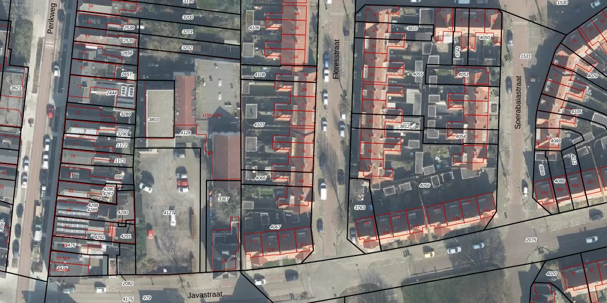 Het perceel waarop Floresstraat 76 staat heeft een oppervlakte van 725 m². Dit is een groot perceel. De perceeloppervlakte wordt geregistreerd door het Kadaster. Gedetailleerde informatie over de maten van dit perceel kunt u vinden in het rapport Kadastrale kaart met maatvoering van Floresstraat 76.