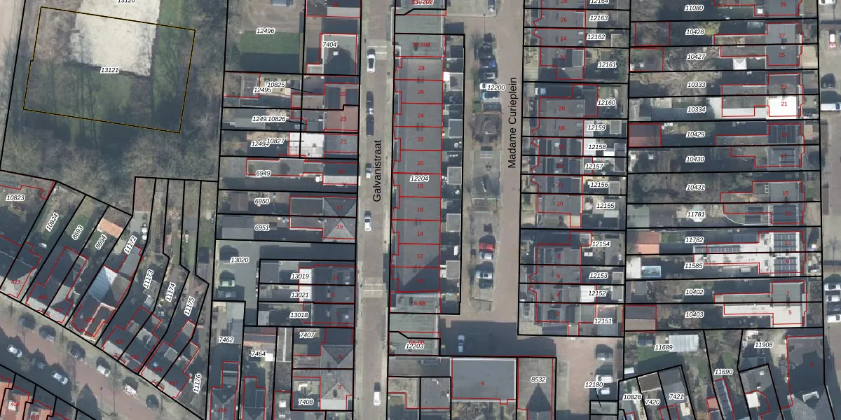 Het perceel waarop Galvanistraat 16 staat heeft een oppervlakte van 1115 m². Dit is een zeer groot perceel. De perceeloppervlakte wordt geregistreerd door het Kadaster. Gedetailleerde informatie over de maten van dit perceel kunt u vinden in het rapport Kadastrale kaart met maatvoering van Galvanistraat 16.