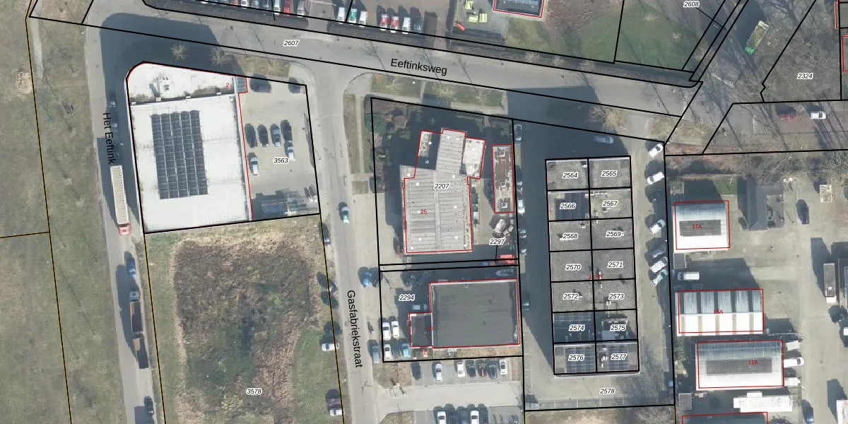 Gasfabriekstraat 25 is gelegen op kadastraal perceel LNK00P2207. Deze kadastrale aanduiding is uniek en wordt gebruikt door het Kadaster om eigendomsrechten en andere zakelijke rechten vast te leggen. Het perceel maakt onderdeel uit van de kadastrale gemeente Lonneker.