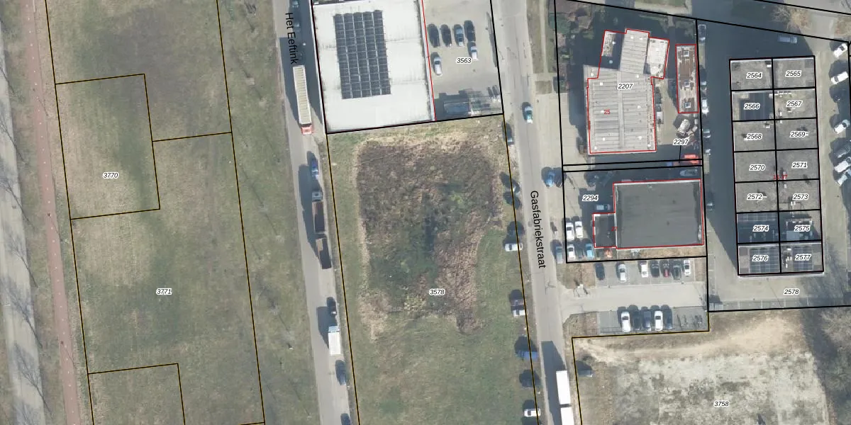 Het perceel waarop Gasfabriekstraat 8 staat heeft een oppervlakte van 3633 m². Dit is een zeer groot perceel. De perceeloppervlakte wordt geregistreerd door het Kadaster. Gedetailleerde informatie over de maten van dit perceel kunt u vinden in het rapport Kadastrale kaart met maatvoering van Gasfabriekstraat 8.