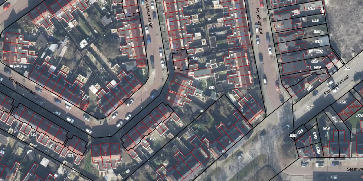 Het perceel waarop Geraniumstraat 106 staat heeft een oppervlakte van 7725 m². Dit is een zeer groot perceel. De perceeloppervlakte wordt geregistreerd door het Kadaster. Gedetailleerde informatie over de maten van dit perceel kunt u vinden in het rapport Kadastrale kaart met maatvoering van Geraniumstraat 106.
