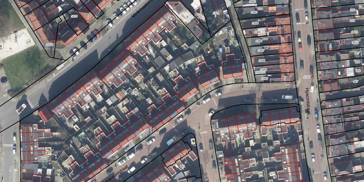 Het perceel waarop Geraniumstraat 22 staat heeft een oppervlakte van 6433 m². Dit is een zeer groot perceel. De perceeloppervlakte wordt geregistreerd door het Kadaster. Gedetailleerde informatie over de maten van dit perceel kunt u vinden in het rapport Kadastrale kaart met maatvoering van Geraniumstraat 22.