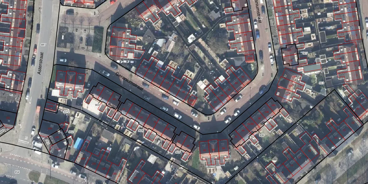 Het perceel waarop Geraniumstraat 55 staat heeft een oppervlakte van 4546 m². Dit is een zeer groot perceel. De perceeloppervlakte wordt geregistreerd door het Kadaster. Gedetailleerde informatie over de maten van dit perceel kunt u vinden in het rapport Kadastrale kaart met maatvoering van Geraniumstraat 55.
