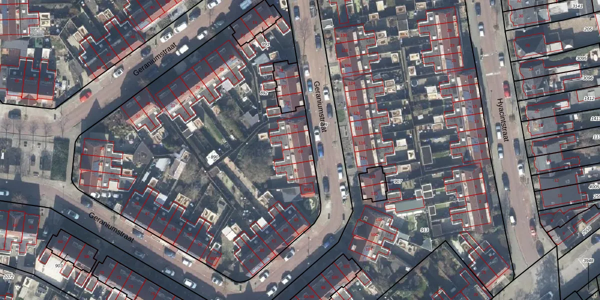 Het perceel waarop Geraniumstraat 69 staat heeft een oppervlakte van 4546 m². Dit is een zeer groot perceel. De perceeloppervlakte wordt geregistreerd door het Kadaster. Gedetailleerde informatie over de maten van dit perceel kunt u vinden in het rapport Kadastrale kaart met maatvoering van Geraniumstraat 69.