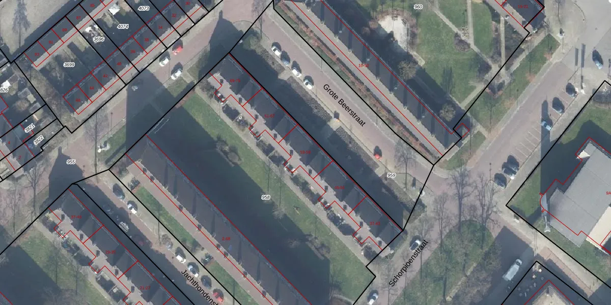 Het perceel waarop Grote Beerstraat 59 staat heeft een oppervlakte van 4755 m². Dit is een zeer groot perceel. De perceeloppervlakte wordt geregistreerd door het Kadaster. Gedetailleerde informatie over de maten van dit perceel kunt u vinden in het rapport Kadastrale kaart met maatvoering van Grote Beerstraat 59.
