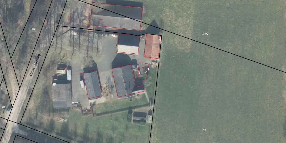 Het perceel waarop Grote Veldweg 48 staat heeft een oppervlakte van 6980 m². Dit is een zeer groot perceel. De perceeloppervlakte wordt geregistreerd door het Kadaster. Gedetailleerde informatie over de maten van dit perceel kunt u vinden in het rapport Kadastrale kaart met maatvoering van Grote Veldweg 48.