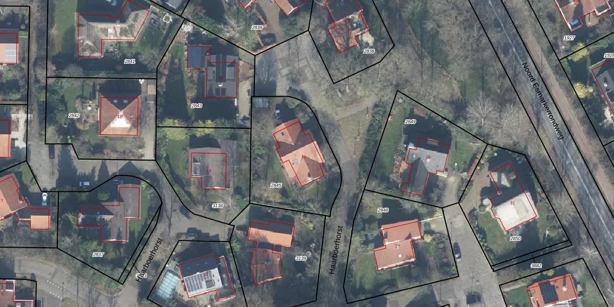 Het perceel waarop Haarboerhorst 19 staat heeft een oppervlakte van 934 m². Dit is een groot perceel. De perceeloppervlakte wordt geregistreerd door het Kadaster. Gedetailleerde informatie over de maten van dit perceel kunt u vinden in het rapport Kadastrale kaart met maatvoering van Haarboerhorst 19.