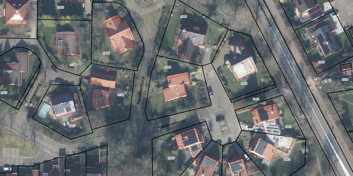 Het perceel waarop Haarboerhorst 27 staat heeft een oppervlakte van 970 m². Dit is een groot perceel. De perceeloppervlakte wordt geregistreerd door het Kadaster. Gedetailleerde informatie over de maten van dit perceel kunt u vinden in het rapport Kadastrale kaart met maatvoering van Haarboerhorst 27.