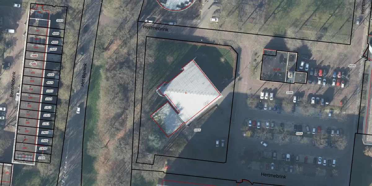 Het perceel waarop Hertmebrink 8 staat heeft een oppervlakte van 3100 m². Dit is een zeer groot perceel. De perceeloppervlakte wordt geregistreerd door het Kadaster. Gedetailleerde informatie over de maten van dit perceel kunt u vinden in het rapport Kadastrale kaart met maatvoering van Hertmebrink 8.