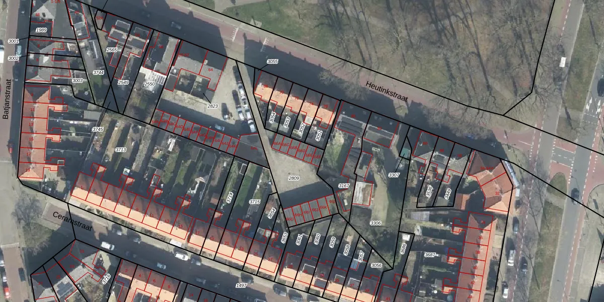 Het perceel waarop Heutinkstraat 66-D staat heeft een oppervlakte van 570 m². Dit is een groot perceel. De perceeloppervlakte wordt geregistreerd door het Kadaster. Gedetailleerde informatie over de maten van dit perceel kunt u vinden in het rapport Kadastrale kaart met maatvoering van Heutinkstraat 66-D.