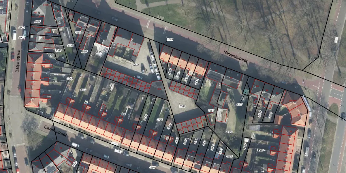 Het perceel waarop Heutinkstraat 66-A staat heeft een oppervlakte van 570 m². Dit is een groot perceel. De perceeloppervlakte wordt geregistreerd door het Kadaster. Gedetailleerde informatie over de maten van dit perceel kunt u vinden in het rapport Kadastrale kaart met maatvoering van Heutinkstraat 66-A.