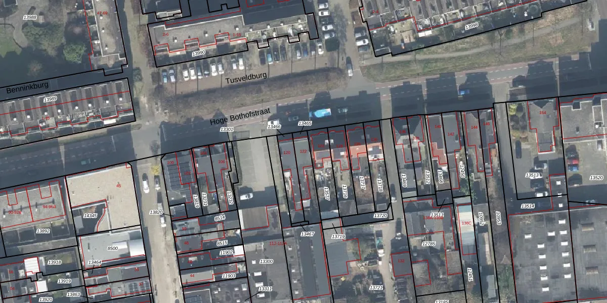 Hoge Bothofstraat 122 is gelegen op kadastraal perceel ESD00D13465. Deze kadastrale aanduiding is uniek en wordt gebruikt door het Kadaster om eigendomsrechten en andere zakelijke rechten vast te leggen. Het perceel maakt onderdeel uit van de kadastrale gemeente Enschede.