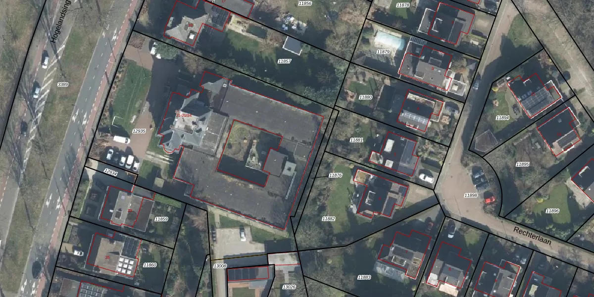 Het perceel waarop Hogelandsingel 21-7 staat heeft een oppervlakte van 3700 m². Dit is een zeer groot perceel. De perceeloppervlakte wordt geregistreerd door het Kadaster. Gedetailleerde informatie over de maten van dit perceel kunt u vinden in het rapport Kadastrale kaart met maatvoering van Hogelandsingel 21-7.