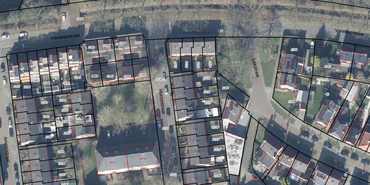 Hunzestraat 44 is gelegen op kadastraal perceel LNK00R2118. Deze kadastrale aanduiding is uniek en wordt gebruikt door het Kadaster om eigendomsrechten en andere zakelijke rechten vast te leggen. Het perceel maakt onderdeel uit van de kadastrale gemeente Lonneker.
