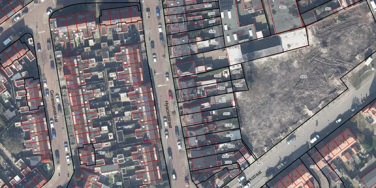 Gebruik de zoekbalk of klik op een perceel voor informatie over de adressen binnen dit perceel.