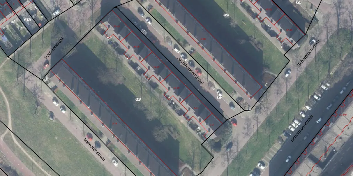 Jachthondenstraat 13 is gelegen op kadastraal perceel LNK00S956. Deze kadastrale aanduiding is uniek en wordt gebruikt door het Kadaster om eigendomsrechten en andere zakelijke rechten vast te leggen. Het perceel maakt onderdeel uit van de kadastrale gemeente Lonneker.