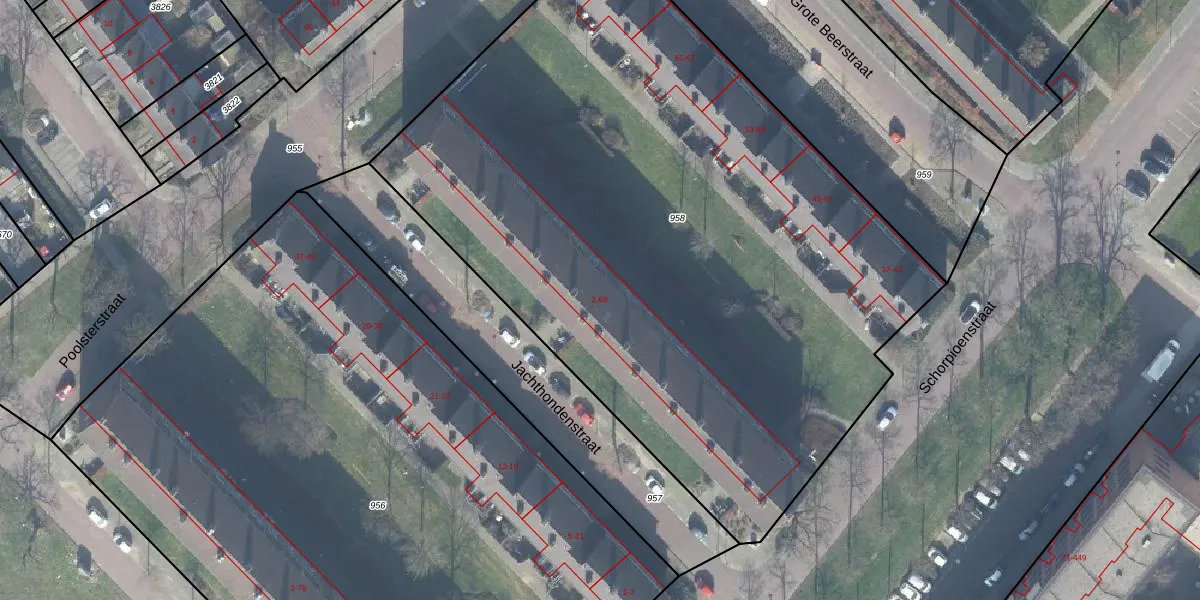 Het perceel waarop Jachthondenstraat 58 staat heeft een oppervlakte van 4755 m². Dit is een zeer groot perceel. De perceeloppervlakte wordt geregistreerd door het Kadaster. Gedetailleerde informatie over de maten van dit perceel kunt u vinden in het rapport Kadastrale kaart met maatvoering van Jachthondenstraat 58.
