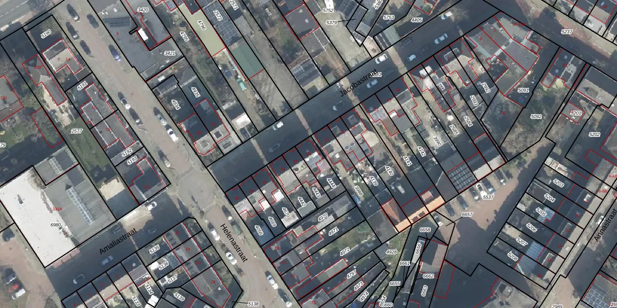 Het perceel waarop Jacobastraat 25 staat heeft een oppervlakte van 129 m². Dit is een middelgroot perceel. De perceeloppervlakte wordt geregistreerd door het Kadaster. Gedetailleerde informatie over de maten van dit perceel kunt u vinden in het rapport Kadastrale kaart met maatvoering van Jacobastraat 25.