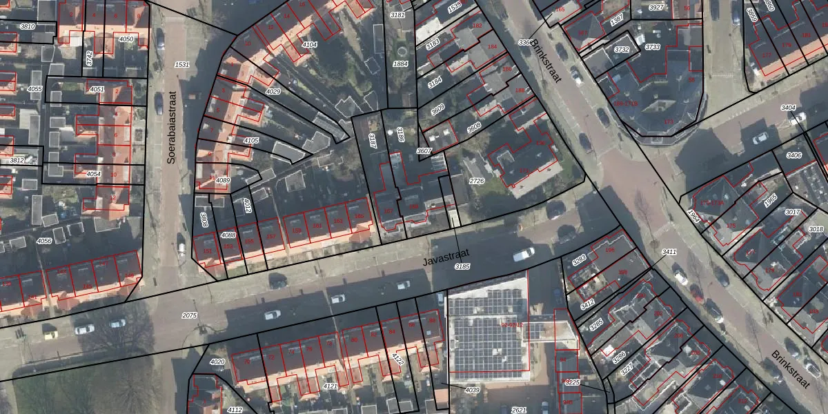 Het perceel waarop Javastraat 169 staat heeft een oppervlakte van 303 m². Dit is een groot perceel. De perceeloppervlakte wordt geregistreerd door het Kadaster. Gedetailleerde informatie over de maten van dit perceel kunt u vinden in het rapport Kadastrale kaart met maatvoering van Javastraat 169.