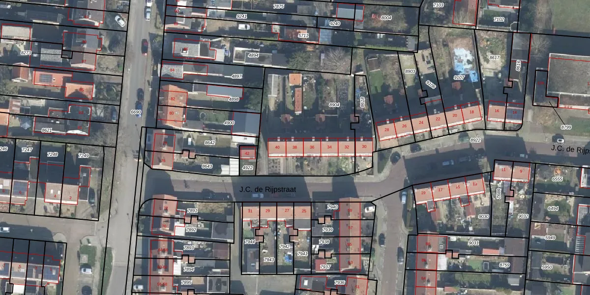 Het perceel waarop J.C. de Rijpstraat 38 staat heeft een oppervlakte van 1620 m². Dit is een zeer groot perceel. De perceeloppervlakte wordt geregistreerd door het Kadaster. Gedetailleerde informatie over de maten van dit perceel kunt u vinden in het rapport Kadastrale kaart met maatvoering van J.C. de Rijpstraat 38.