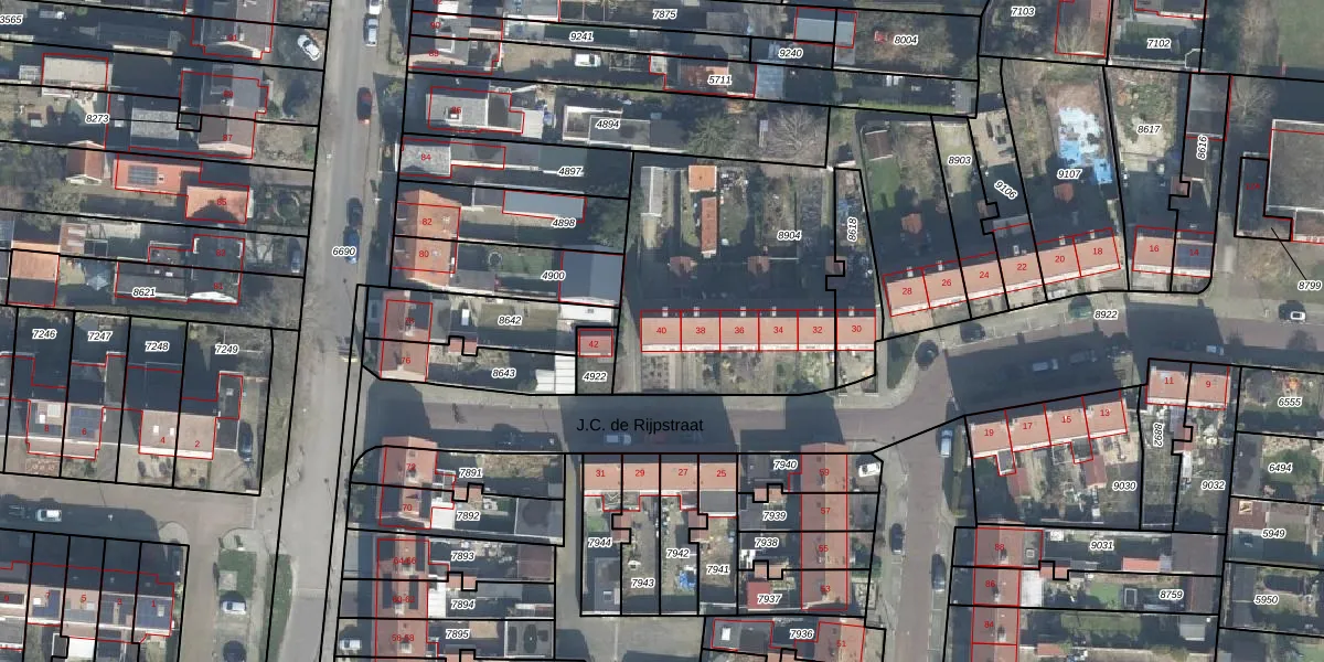Het perceel waarop J.C. de Rijpstraat 40 staat heeft een oppervlakte van 1620 m². Dit is een zeer groot perceel. De perceeloppervlakte wordt geregistreerd door het Kadaster. Gedetailleerde informatie over de maten van dit perceel kunt u vinden in het rapport Kadastrale kaart met maatvoering van J.C. de Rijpstraat 40.