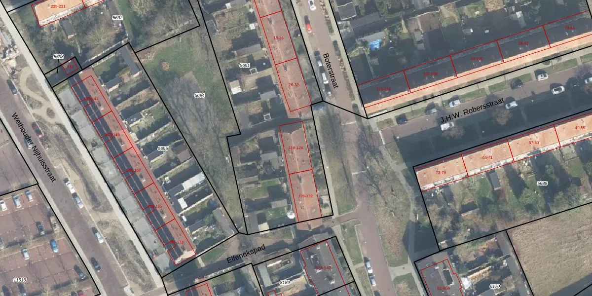 Het perceel waarop J.H.W. Robersstraat 124 staat heeft een oppervlakte van 3085 m². Dit is een zeer groot perceel. De perceeloppervlakte wordt geregistreerd door het Kadaster. Gedetailleerde informatie over de maten van dit perceel kunt u vinden in het rapport Kadastrale kaart met maatvoering van J.H.W. Robersstraat 124.