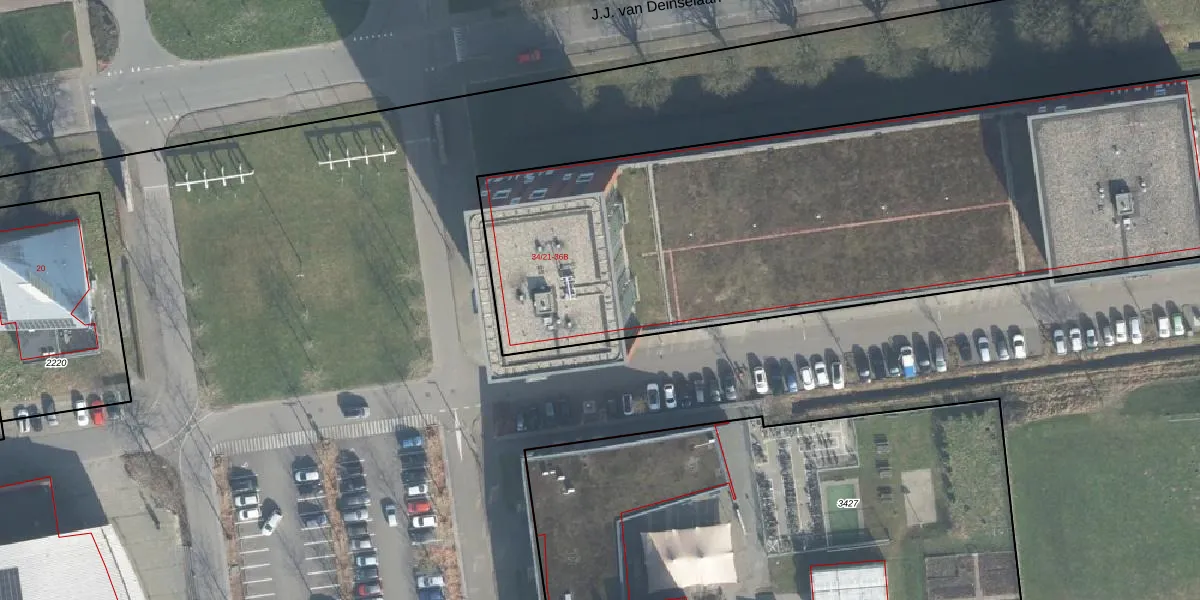 Het perceel waarop J.J. van Deinselaan 34-42 staat heeft een oppervlakte van 4485 m². Dit is een zeer groot perceel. De perceeloppervlakte wordt geregistreerd door het Kadaster. Gedetailleerde informatie over de maten van dit perceel kunt u vinden in het rapport Kadastrale kaart met maatvoering van J.J. van Deinselaan 34-42.