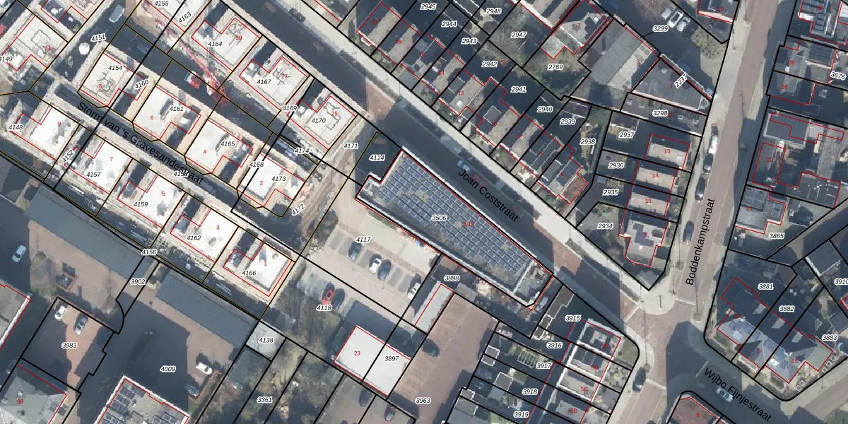 Het perceel waarop Joan Coststraat 13 staat heeft een oppervlakte van 607 m². Dit is een groot perceel. De perceeloppervlakte wordt geregistreerd door het Kadaster. Gedetailleerde informatie over de maten van dit perceel kunt u vinden in het rapport Kadastrale kaart met maatvoering van Joan Coststraat 13.
