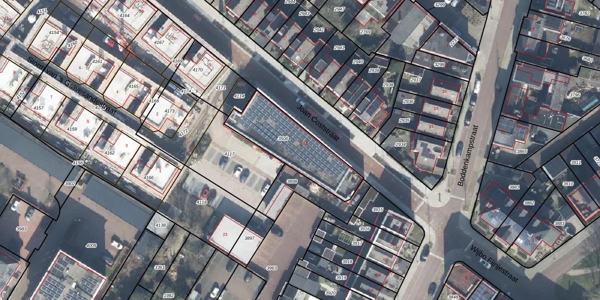 Het perceel waarop Joan Coststraat 9 staat heeft een oppervlakte van 607 m². Dit is een groot perceel. De perceeloppervlakte wordt geregistreerd door het Kadaster. Gedetailleerde informatie over de maten van dit perceel kunt u vinden in het rapport Kadastrale kaart met maatvoering van Joan Coststraat 9.