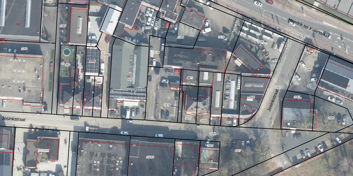 Het perceel waarop Josinkstraat 40 staat heeft een oppervlakte van 1711 m². Dit is een zeer groot perceel. De perceeloppervlakte wordt geregistreerd door het Kadaster. Gedetailleerde informatie over de maten van dit perceel kunt u vinden in het rapport Kadastrale kaart met maatvoering van Josinkstraat 40.