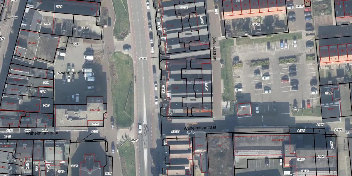 Het perceel waarop Julianastraat 35 staat heeft een oppervlakte van 451 m². Dit is een groot perceel. De perceeloppervlakte wordt geregistreerd door het Kadaster. Gedetailleerde informatie over de maten van dit perceel kunt u vinden in het rapport Kadastrale kaart met maatvoering van Julianastraat 35.