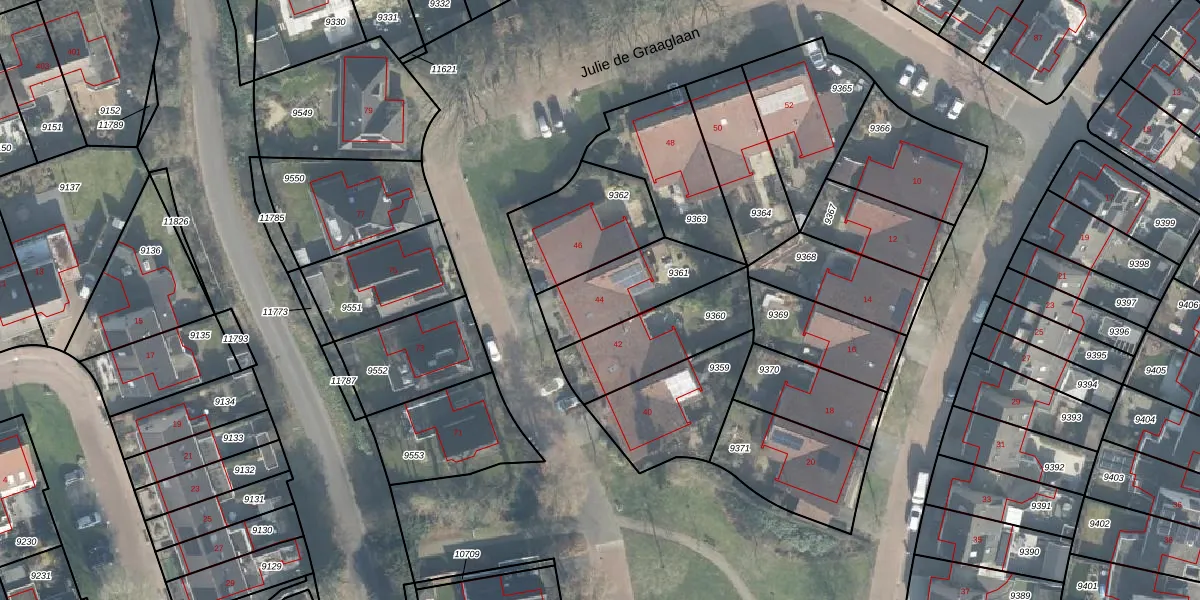 Julie de Graaglaan 44 is gelegen op kadastraal perceel LNK00N9361. Deze kadastrale aanduiding is uniek en wordt gebruikt door het Kadaster om eigendomsrechten en andere zakelijke rechten vast te leggen. Het perceel maakt onderdeel uit van de kadastrale gemeente Lonneker.