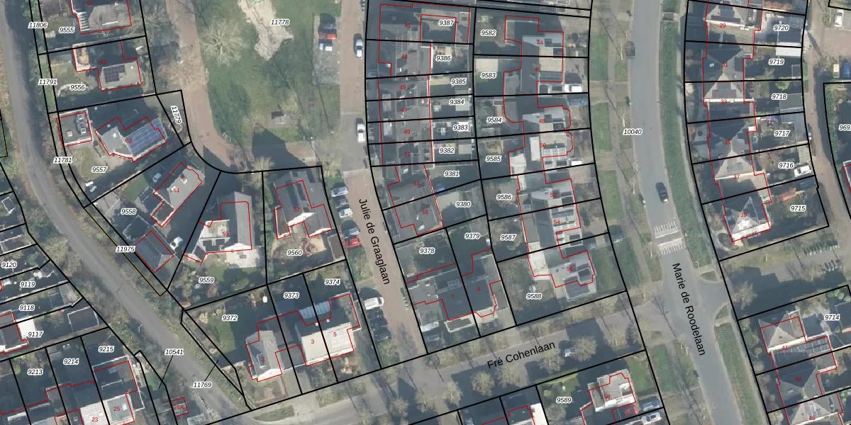 Julie de Graaglaan 55 is gelegen op kadastraal perceel LNK00N9380. Deze kadastrale aanduiding is uniek en wordt gebruikt door het Kadaster om eigendomsrechten en andere zakelijke rechten vast te leggen. Het perceel maakt onderdeel uit van de kadastrale gemeente Lonneker.
