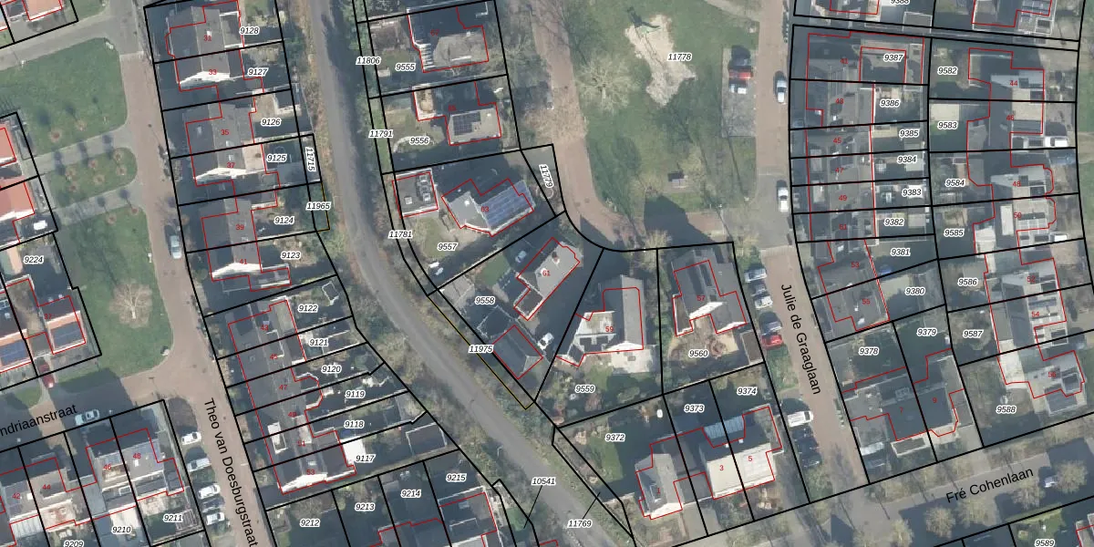 Het perceel waarop Julie de Graaglaan 61 staat heeft een oppervlakte van 503 m². Dit is een groot perceel. De perceeloppervlakte wordt geregistreerd door het Kadaster. Gedetailleerde informatie over de maten van dit perceel kunt u vinden in het rapport Kadastrale kaart met maatvoering van Julie de Graaglaan 61.
