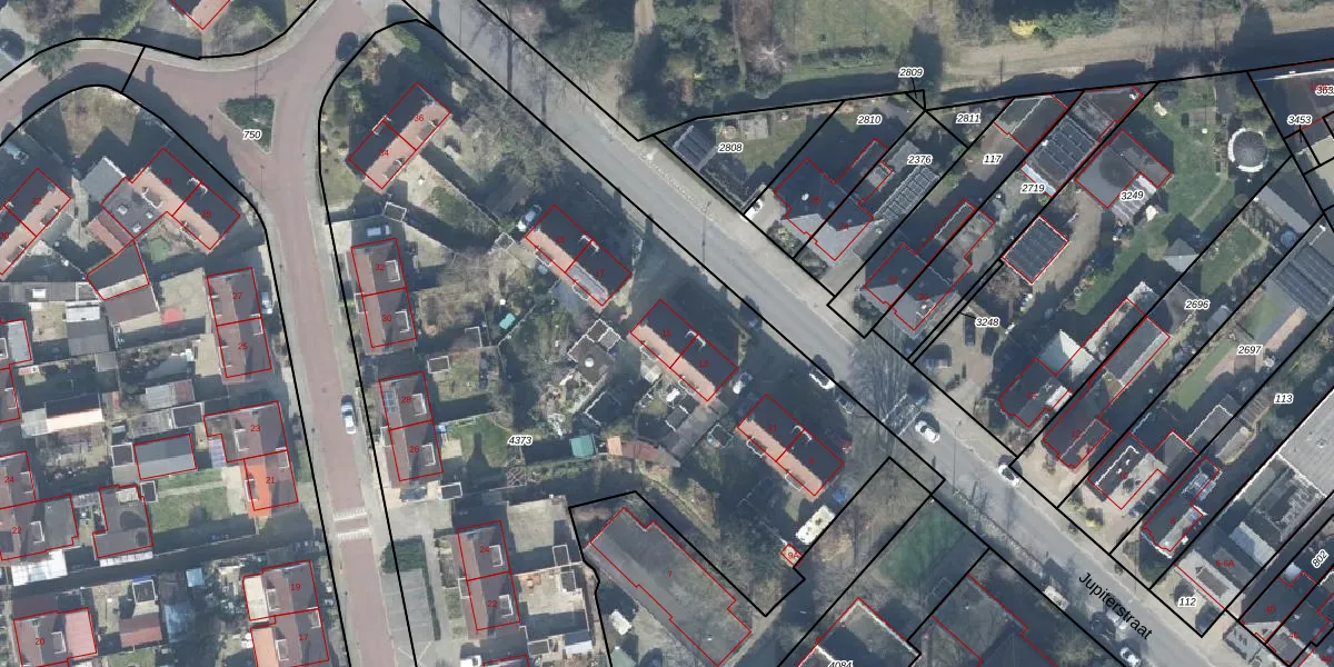 Het perceel waarop Jupiterstraat 15 staat heeft een oppervlakte van 7416 m². Dit is een zeer groot perceel. De perceeloppervlakte wordt geregistreerd door het Kadaster. Gedetailleerde informatie over de maten van dit perceel kunt u vinden in het rapport Kadastrale kaart met maatvoering van Jupiterstraat 15.