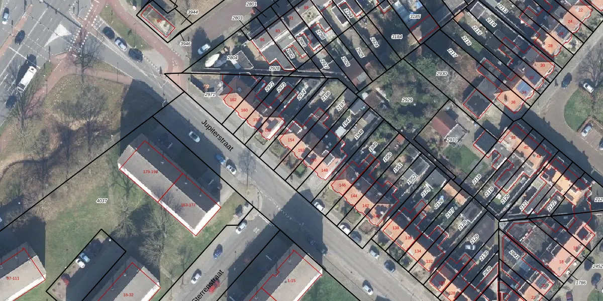 Het perceel waarop Jupiterstraat 152 staat heeft een oppervlakte van 187 m². Dit is een middelgroot perceel. De perceeloppervlakte wordt geregistreerd door het Kadaster. Gedetailleerde informatie over de maten van dit perceel kunt u vinden in het rapport Kadastrale kaart met maatvoering van Jupiterstraat 152.