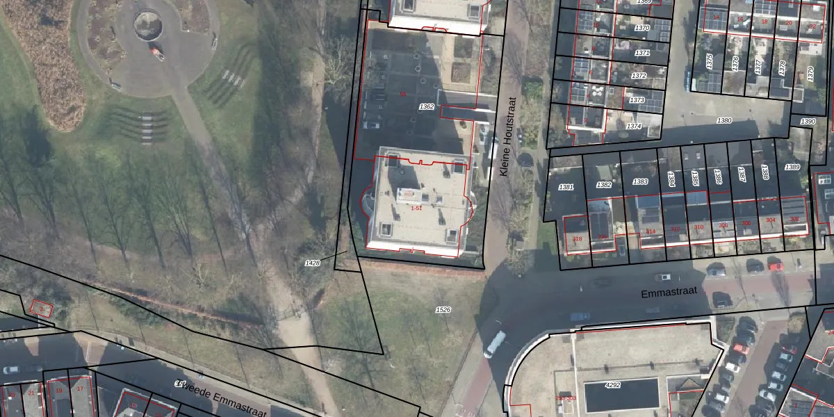 Het perceel waarop Kleine Houtstraat 41 staat heeft een oppervlakte van 1880 m². Dit is een zeer groot perceel. De perceeloppervlakte wordt geregistreerd door het Kadaster. Gedetailleerde informatie over de maten van dit perceel kunt u vinden in het rapport Kadastrale kaart met maatvoering van Kleine Houtstraat 41.