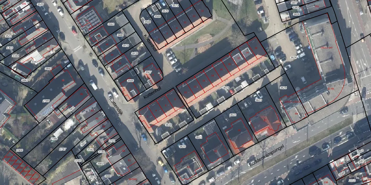 Het perceel waarop Kottenhof 10 staat heeft een oppervlakte van 1046 m². Dit is een zeer groot perceel. De perceeloppervlakte wordt geregistreerd door het Kadaster. Gedetailleerde informatie over de maten van dit perceel kunt u vinden in het rapport Kadastrale kaart met maatvoering van Kottenhof 10.