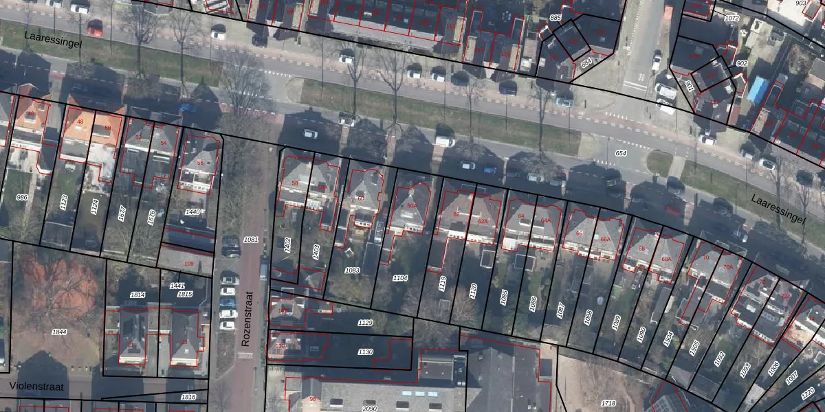 Het perceel waarop Laaressingel 60-A staat heeft een oppervlakte van 401 m². Dit is een groot perceel. De perceeloppervlakte wordt geregistreerd door het Kadaster. Gedetailleerde informatie over de maten van dit perceel kunt u vinden in het rapport Kadastrale kaart met maatvoering van Laaressingel 60-A.